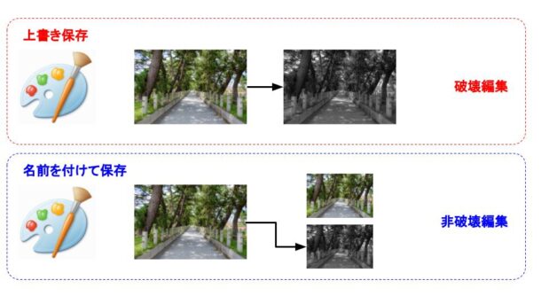 「上書き保存」は元データに上書きし、元の画像に戻すことはできない破壊編集です。一方で「名前を付けて保存」は元データはそのままに新たに画像を作成する非破壊編集です。