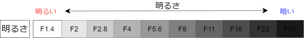まずは代表的なF値の値と、F値を1つ隣に動かすとカメラに入る光量が2倍または1/2倍になることを覚えましょう。